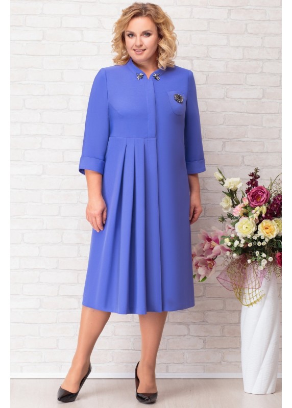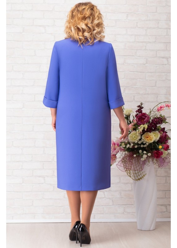 Платье женское из приятной на ощупь однотонной ткани с небольшим стрейчем. Полуприлегающего силуэта, без подкладки, с плечевыми накладками, с воротником стойкой и с потайной застежкой до талии на две пуговицы и одну кнопку. Перед с нагрудными выточками. Левая часть переда цельная, с накладным карманом по линии груди. Правая часть переда отрезная, с тремя односторонними складками от подреза. Спинка со среднем швом. Рукава втачные, одношовные, длиной три четверти. Низ рукава оформлен отложным манжетам. Платье декорировано пришивными украшениями со стразами, на воротнике в виде стрекоз и на кармане - в виде броши. Длина изделия по центру спинки 110 см. Длина рукава 46 см.