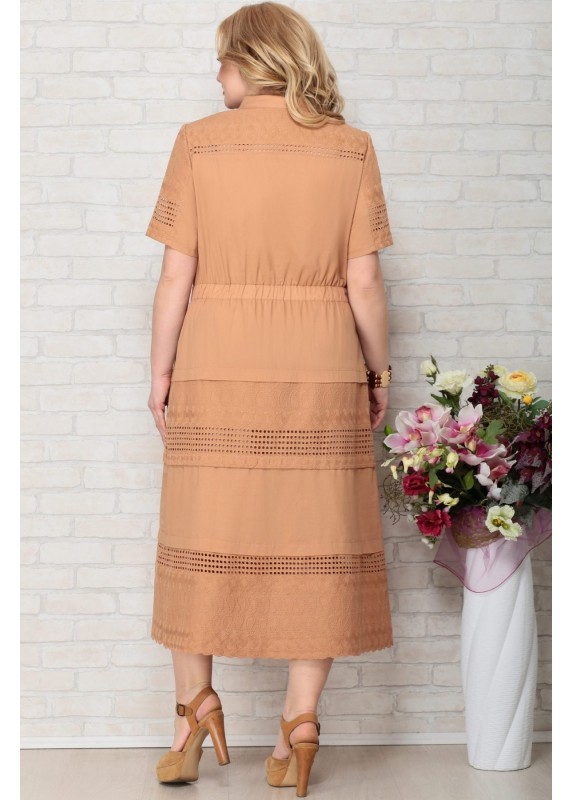 Платье женское из хлопковой ткани с шитьем и однотона хлопка, полуприлегающего силуэта слегка расширенное к низу. Платье на хлопковой подкладке, с плечевыми накладками. Воротник рубашечного вида, платье по талии на резинке, по переду застегивается на пуговицы. Перед с нагрудными вытачками. Горловина круглой формы, платье на хб подкладке. Длина по центру спинки 127 см, длина рукава 27 см.
