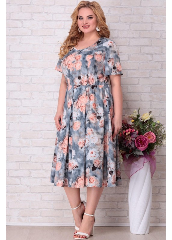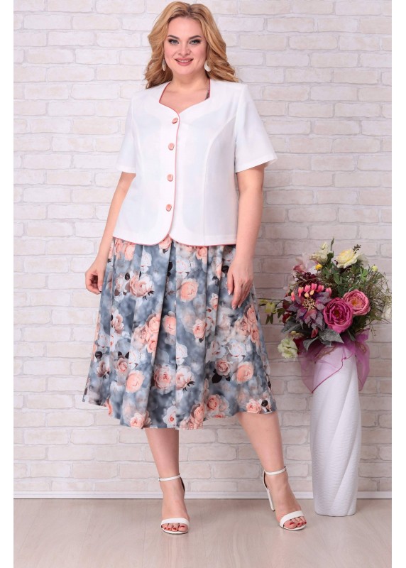 Платье женское из ткани ниагара , полуприлегающего силуэта слегка расширенное от талии. Платье на подкладке, с плечевыми накладками, по талии присборено на резинку. Перед с нагрудными вытачками. Длина по центру спинки 118 см, длина рукава 27 см. Горловина круглой формы, платье на подкладке. Жакет без подкладки, с плечевыми накладками, по низу отделан черным кантом, застегивается на декоративные пуговицы. Перед с нагрудными вытачками. Длина по спинке 59 см, длина рукава 30 см. Состав 70% ПЭ, 25 % вискоза, 5 % спандекс.