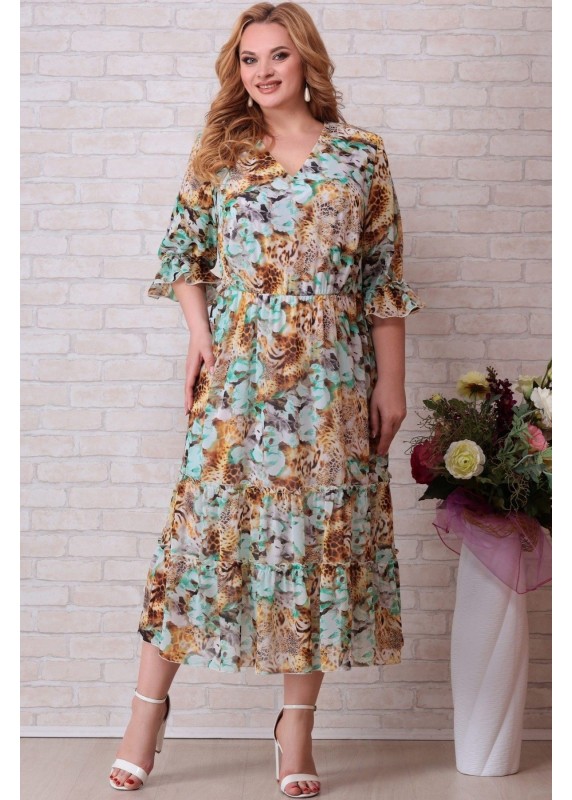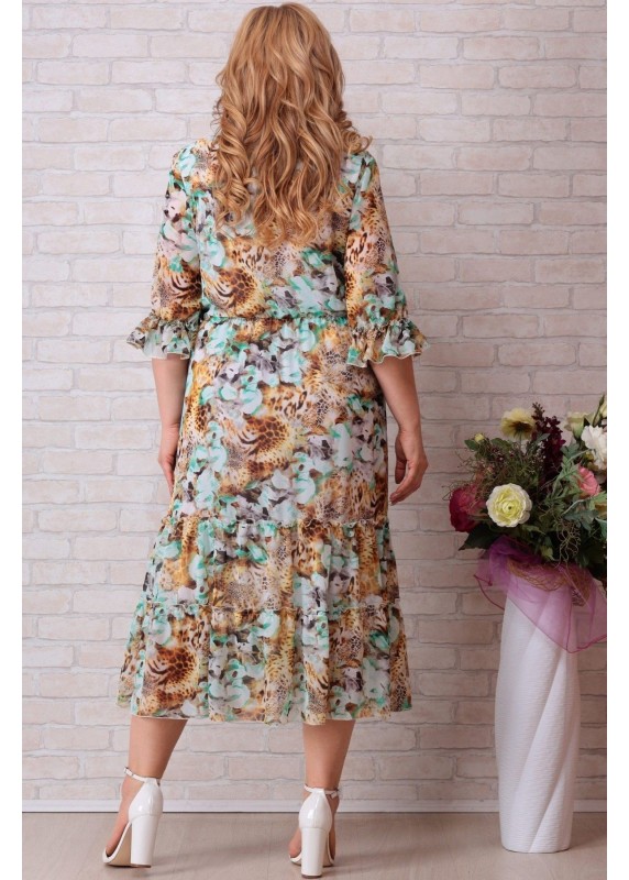 Платье женское из ткани шифон , полуприлегающего силуэта слегка расширенное от талии. Платье на подкладке, с плечевыми накладками, по талии присборено на резинку, по низу пришито два яруса. Перед с нагрудными вытачками. Длина по центру спинки 125 см, длина рукава 47 см. Горловина круглой формы, платье на подкладке.
