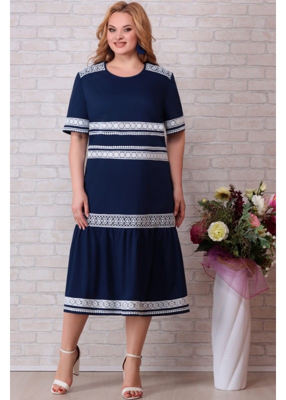 Платье женское из ткани хлопок (синего цвета) и хлопкового кружева ( белого цвет), полуприлегающего силуэта расширенное от талии, по низу. Платье без хб подкладке, с плечевыми накладками, Длина 120 см. Длина рукава 28 см.