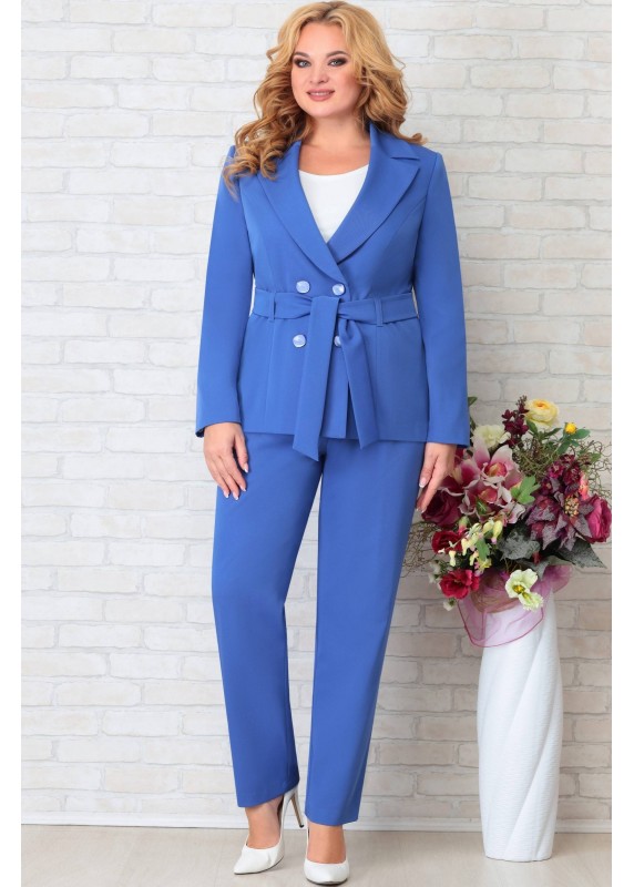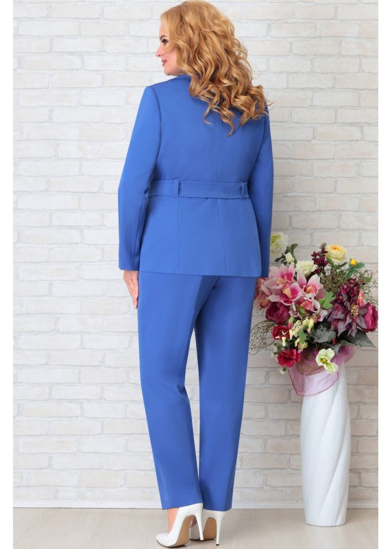Комплект женский состоящий из жакета и брюк. Жакет на подкладке, с плечевыми накладками. Жакет двух бортный,застегивается на петли пуговицы и пояс. Длина изделия по спинке 68 см, длина рукава 62 см. Брюки по бокам на резинке, зауженные к низу. Длина изделия от пояса 101 см.