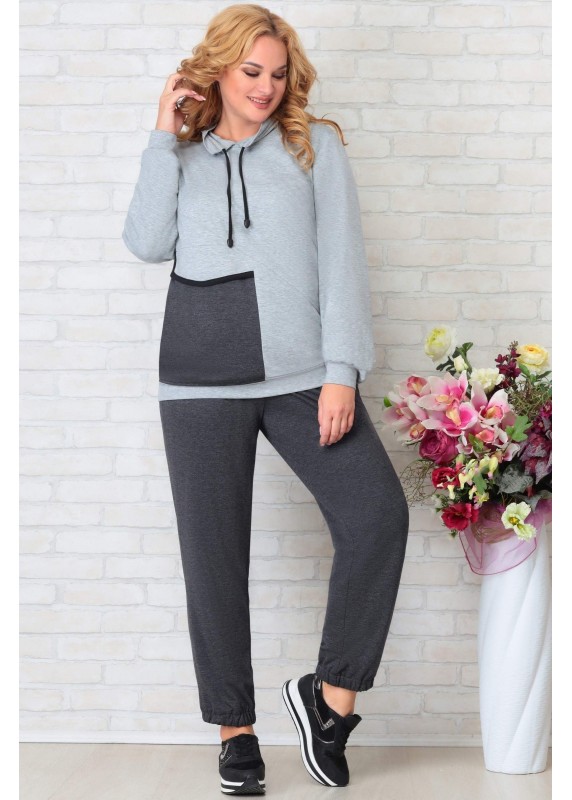 Комплект женский (тройка) состоящий из брюк, кофты и накидки-жилетки. Основная ткань спорт двухнитка. Брюки на поясе на резинке, есть действующие карманы в боковом шве. Длина брюк от пояса 99 см . Цвет темно серый. Кофта выполнена на контрасте двух цветов светло серого и темно серогого. Воротник стойка. Длина рукава с манжетом 63 см, длина по спинке 71 см. Накидка выполнена из темно серого цвета ткани, как и брюки. Накидка с капюшоном. По спинке , разрез, окантован черной тканью. Длина изделия 120 см