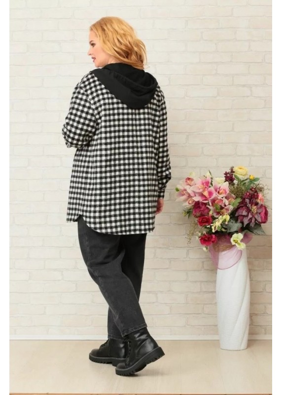 Рубашка женская, выполнена из теплой ткани в рисунок черно белая клетка. Рубашка свободного кроя, застегивается на петли пуговицы, по переду нашиты действующие карманы на уровне линии груди. Капюшон черного цвета, выполнена из двухнитка. Длина изделия по спинке82 см, длина рукава от плеча 63 см, рукав спущенный.