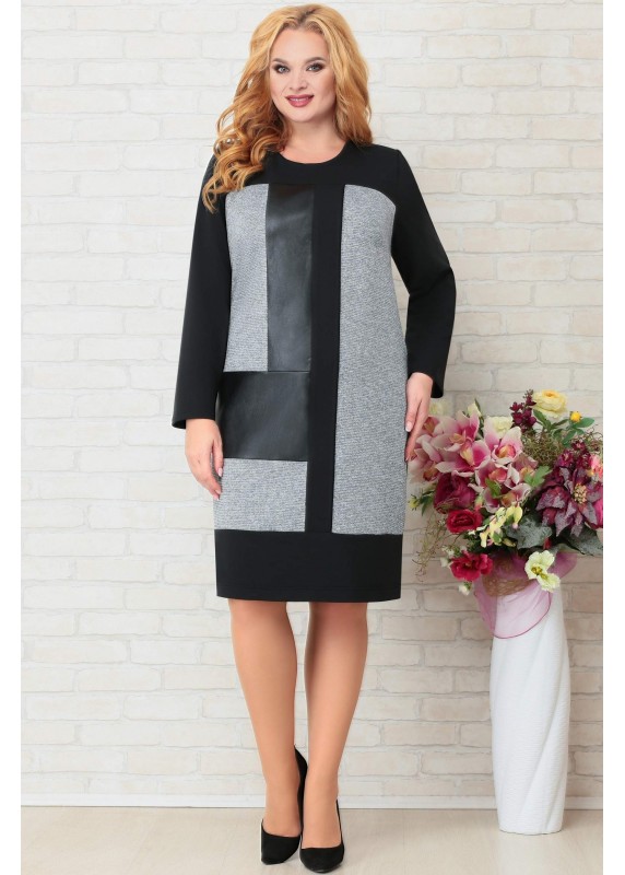Платье женское, выполнено из трикотажного полотна , со вставками по переду из эко кожи и трикотажа из меланжа, свободного силуэта. Длина по спинке102-103 см, длина рукава 59-60 см.