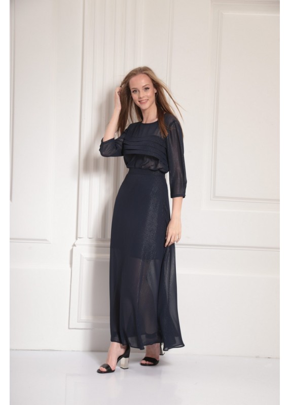 Шифоновая юбка с ненавязчиыми серебристыми полосочками. Изделие на притачном поясе и на подкладке.