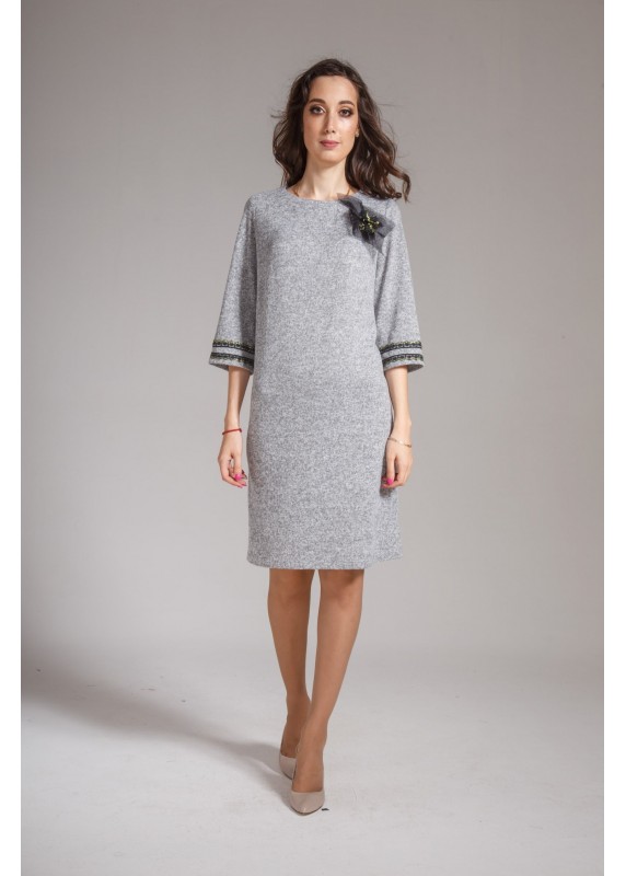 трикотажное платье с отделкой по рукаву контрастным кружеом с легким блеском и дизайнерским украшением у горловины