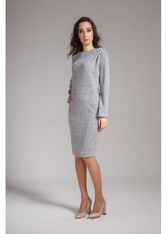 трикотажное платье с декоративными ассиметричными складками у горловины, украшенными бусинами, по спинке небольшая шлица