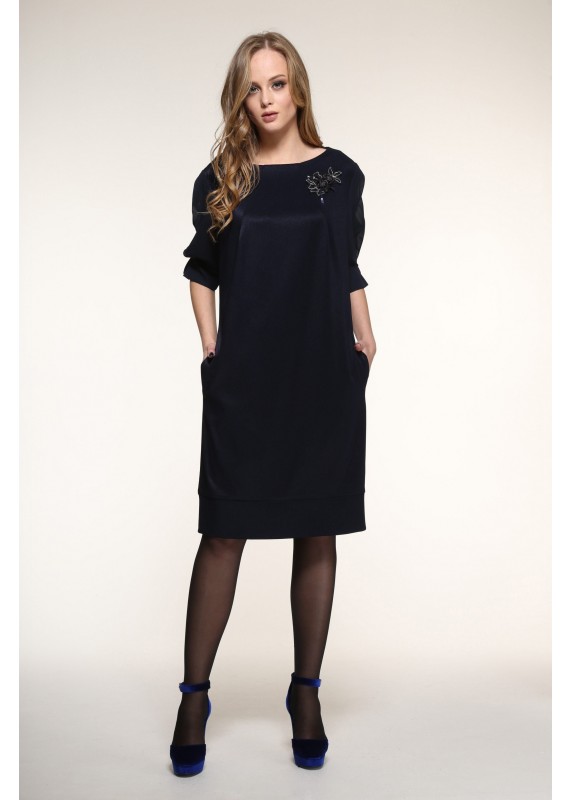 Нарядное платье из плотного красивого трикотажа с карманами, шифоновыми рукавами и дизайнерским украшением сбоку по груди. Длина изделия на рост 164- 100см, на 170- 107см, длина рукава 164- 36см, 170- 39см. Цвета- синий, черный, бутылка, вишня.