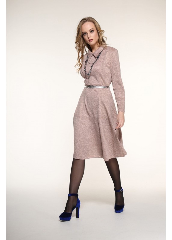 Трикотажное платье,с воротником, приталенное с юбкой клеш, застегивается на пуговицу по спинке на горловине с каплей, пояс в комплекте. Длина изделия на 164- 98см, 170- 105см, длина рукава 164- 54см, 170- 57см.