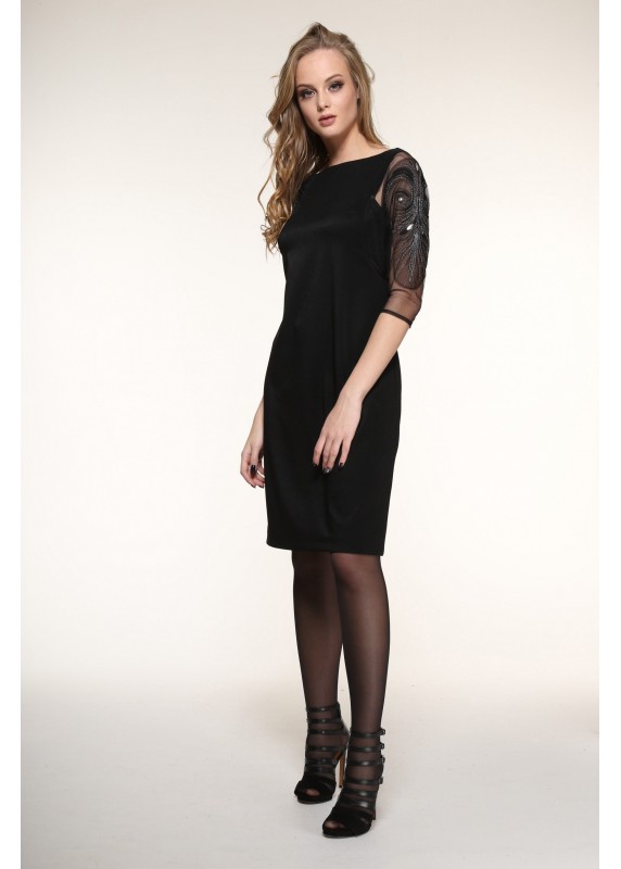 Нарядное платье из плотного красивого трикотажа с отделкой из сетки с дизайнерской вышивкой по рукаву, длина изделия на рост 164- 91, 170- 96, длина рукава на 164- 40, 170- 43, цвета- черный и зеленый