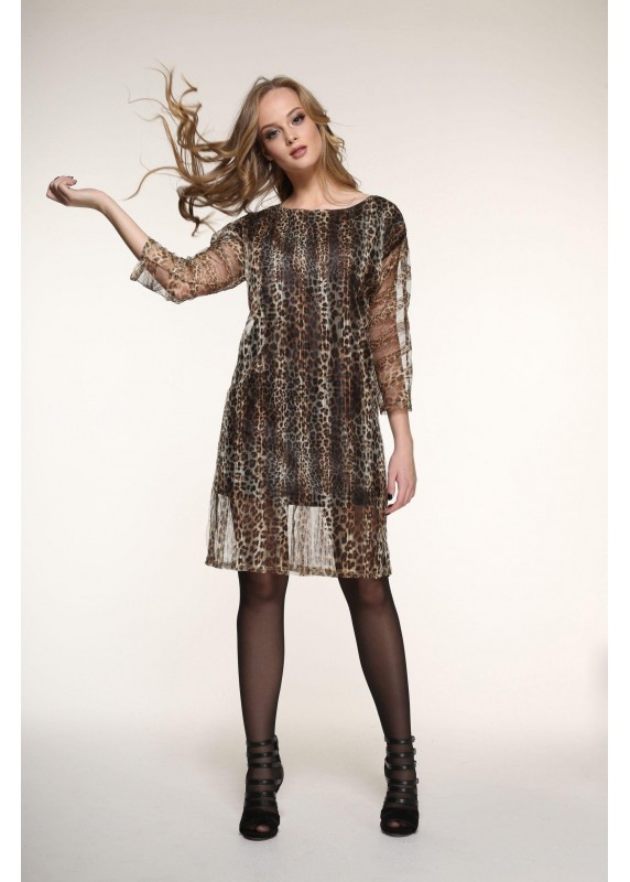 Нарядное платье из сетки с леопардовым дизайном, на подкладке, сзади разрез, длина изделия 164- 90, 170- 97см, длина рукава от горловины 164- 50, 170- 53