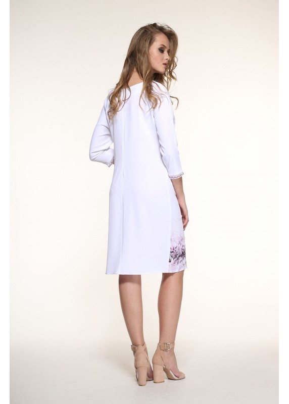 Платье прямого силуэта с отделкой по полочке снизу и рукавам вышитой сеткой, молния по спинке сверху, рукава- реглан.