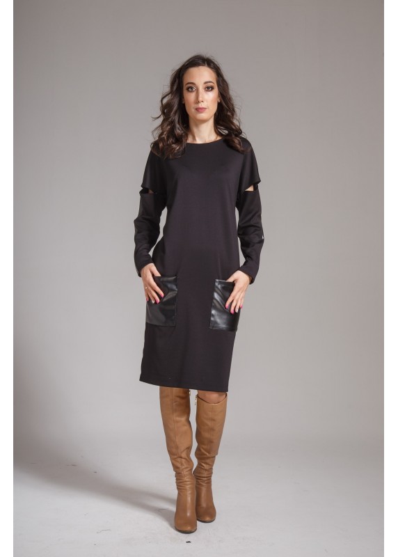 трикотажное платье с отделкой из кожи, на пройме спереди декоративные щели ( серый, черный)