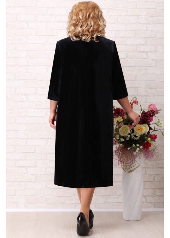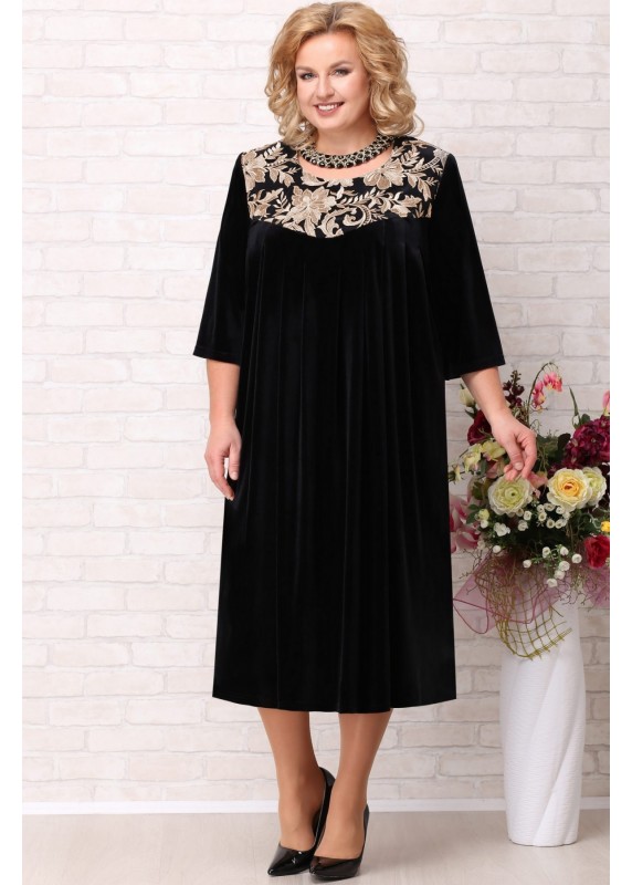 Платье женское из бархата на трикотажной основе; свободного, слегка расширенного к низу, силуэта; без подкладки, с плечевыми накладками. Перед с фигурной кокеткой. Кокетка украшена наложением ажурного кружева. От кокетки застрочены восемь односторонних мягких складок. Спинка со средним швом. Рукава втачные, одношовные, длиной ¾. Горловина круглой формы, обработана обтачкой. Длина по центру спинки 115 см. Длина рукава 44 см.