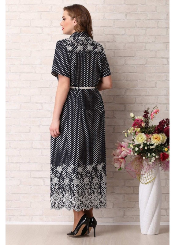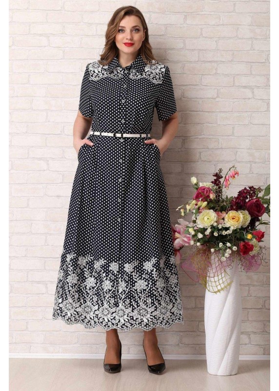 Платье женское из хлопчатобумажной ткани с принтом «горохи» и шитьем. Платье полуприлегающего силуэта, отрезное по талии; без подкладки, с плечевыми накладками, с центральной застежкой на 10 обметанных петель и 10 пуговиц, с воротником рубашечного типа на стойке. Лиф переда с кокетками, нагрудными вытачками и двумя складками от талии. Лиф спинки с кокеткой и рельефными швами. Кокетки переда и спинки выполнены из вышивки. Юбка с карманами в боковых швах. Низ юбки декорирован фестончатым краем. Рукава втачные, короткие, одношовные. В зависимости от размера отличаются дизайном. В размерах 54,56,58 цельные. В размерах 60,62,64 рукава состоят из передней и задней части с наложением друг на друга по центру, по низу части рукавов скреплены патой с пуговицей. Дизайн ткани горохи с шитьем и анюткины глазки с шитьем. Платье дополнено ремнем, продевающимся в шлевки. Размеры 60,62,64 не укомплектованы ремнями. Длина по центру спинки 134-136 см. Длина рукава 26-27 см.
