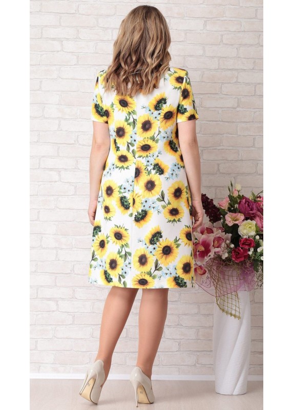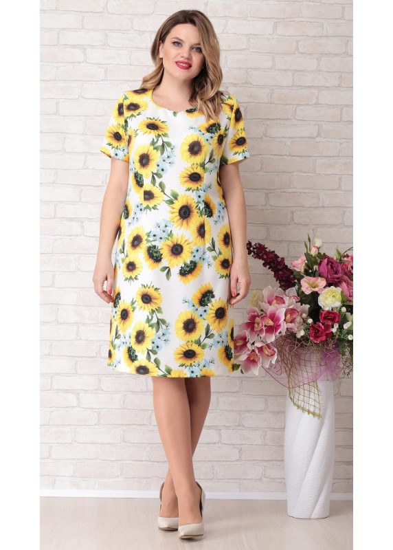 Платье женское из эластичной принтованной ткани; полуприлегающего силуэта, расширенное к низу; без подкладки, с плечевыми накладками. Перед с нагрудными и талиевыми вытачками. Спинка со средним швом и вытачками. Рукава втачные, одношовные. Горловина фигурной формы по переду, обработана обтачкой. Длина по центру спинки 100 см. Длина рукава 22 см.