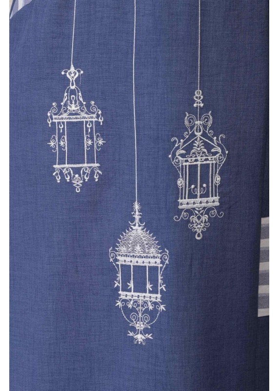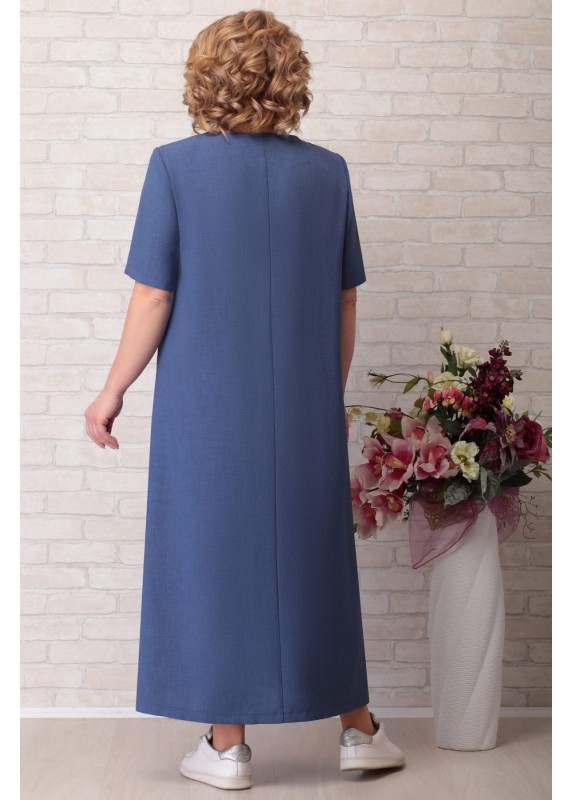 Платье женское из льна-вишера; свободного силуэта; без подкладки, с плечевыми накладками. Перед с асимметричной кокеткой, со средним швом; состоит из стачных деталей, выполненных из ткани разных дизайнов. Спинка со средним швом. Рукава втачные, одношовные. Горловина круглой формы, обработана обтачкой. Перед изделия декорирован вышивкой в виде фонариков и пуговицами. Длина платья по центру спинки 128-129 см. Длина рукава 29 см.