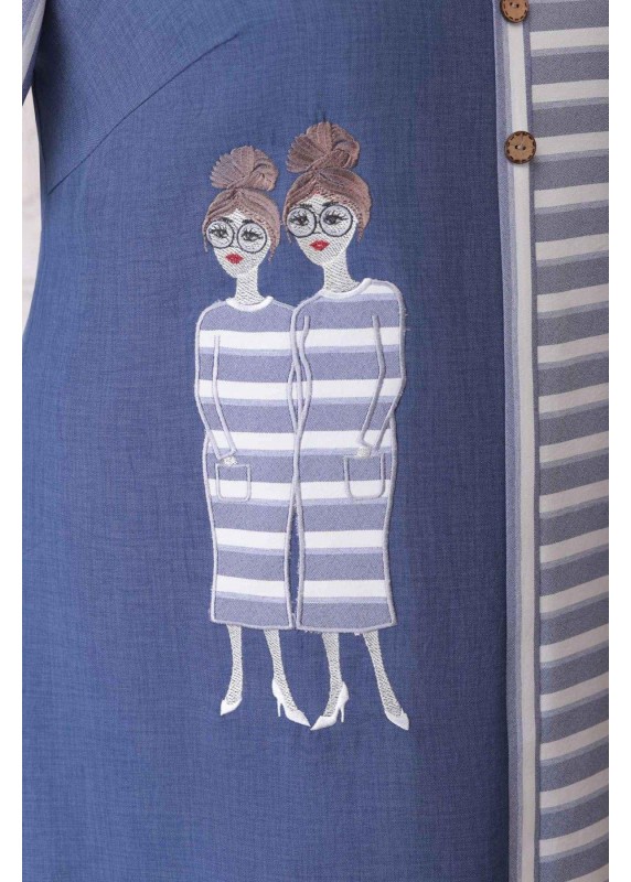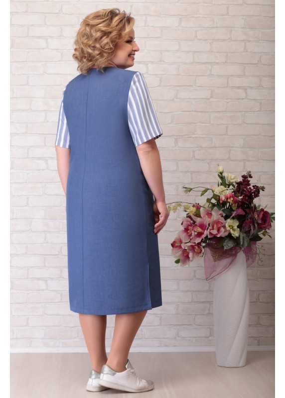 Платье женское из однотонного льна-вишера и полоски; полуприлегающего силуэта; без подкладки, с плечевыми накладками. Перед с нагрудными вытачками. Спинка со средним швом. Рукава втачные, одношовные. Горловина круглой формы, обработана обтачкой. Перед изделия украшен вышивкой. Длина платья по центру спинки 107 см. Длина рукава 30 см.